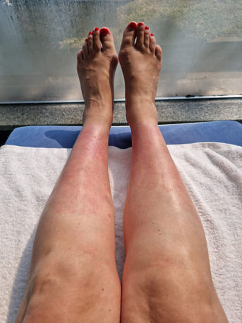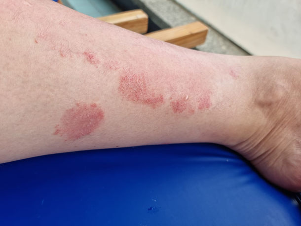 «Começaram a aparecer-me umas manchinhas bastante pequeninas, na parte detrás das pernas. Entretanto, com a pandemia e com a segunda toma da vacina alastraram, conforme se vê estas placas bastante grandes, até à zona do joelho.